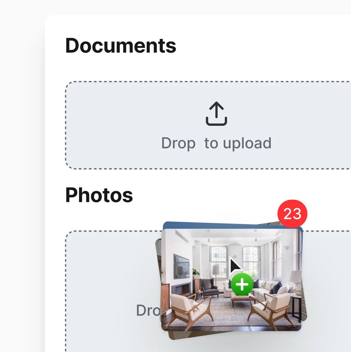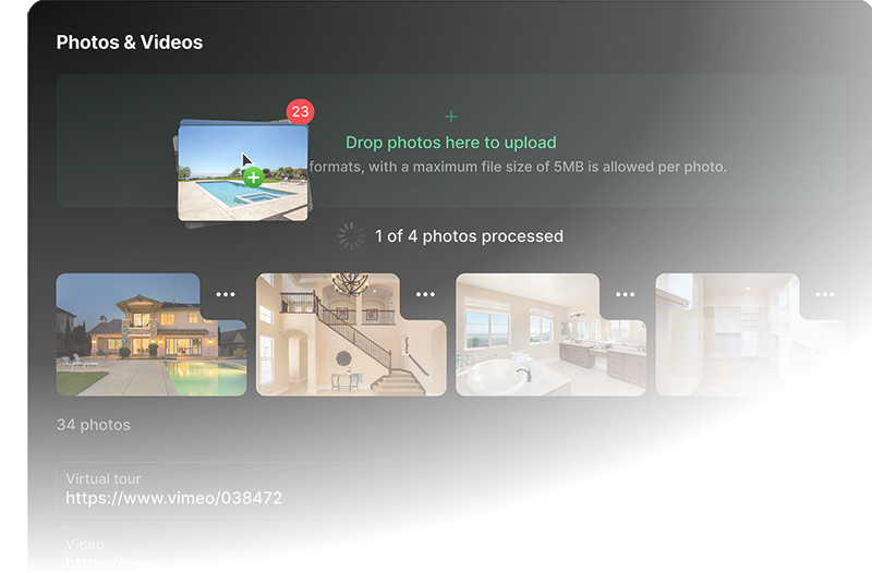 Drag-and-drop photos, videos, virtual tours, and documents.